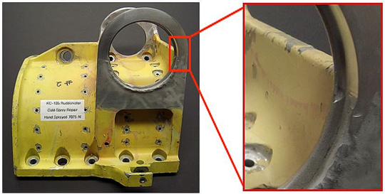 The technology has also been under development for the military as a method to dramatically reduce maintenance costs across the Department of Defense by repairing previously un-repairable assets, such as the KC-135 Ruddervator part shown in Figure 3. Another example is a very large aluminum 6061 Navy valve actuator with corrosion damage and internal bore sealing surface wear, which was cold sprayed, re-machined, and returned to service with a savings of over $40,000 per part compared to a new replacement. A collage of the part and the repair process are shown in Figure 4. The as-sprayed 6061 coating had a tensile strength of 38 ksi [262 MPa], 3% ductility, with adhesion strengths well in excess of 10 ksi [68 MPa].